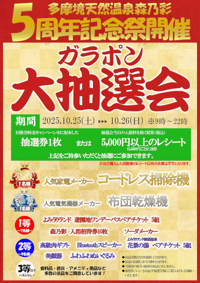 東京・町田市の「多摩境天然温泉 森乃彩」で5周年記念のイベントを開催!