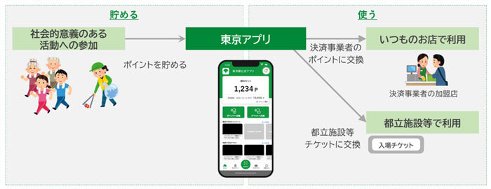 社会的意義のある活動に参加した際に、民間決済事業者のポイントや都立施設などの入場チケットへの交換等が可能な、「東京ポイント」を付与するサービスを提供している。