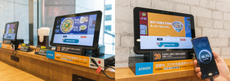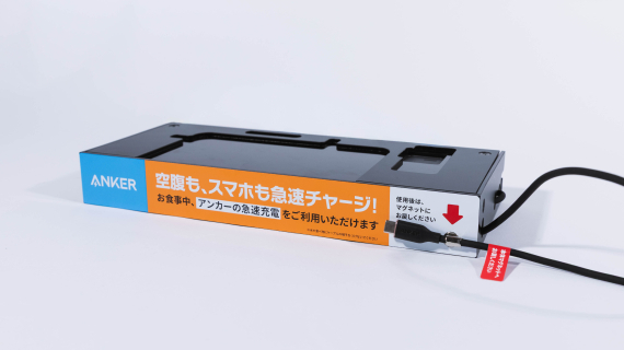 今回、「吉野家」の客席に設置されたAnkerの充電ケーブルは、外装にシリコン素材を採用することによって、従来のケーブルにはない柔らかさを実現した、絡みにくい「Anker PowerLine III Flow USB-C & USB-C ケーブル」。座席に設置された充電ボックス内にAnkerの電源タップを備えており、その電源タップに接続されたケーブルによる最大67W出力で、スマートフォンやタブレット端末を急速充電できる。