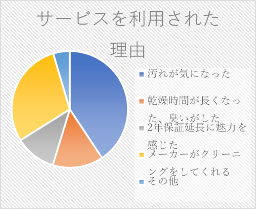 同サービスを利用した理由を尋ねた質問では、「汚れが気になった」「乾燥時間が長くなった、臭いがした」といった乾燥機能の低下とともに、「メーカーが清掃してくれること」(29%)、「延長保証」(11%)といった回答が寄せられ、安心感と信頼につながっていることが明らかになっている。