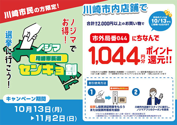 川崎市長選挙にともなう「センキョ割」では、期間中に川崎市長選挙の投票済証明書、または投票所の看板の写真を店頭にて提示すると、合計2000円以上の会計で、川崎市の市外局番(044)にちなんだ1044円分のポイント(期間・用途限定で、使用期間は10月13日~2026年2月28日)が還元される。なお、「センキョ割」はモバイル会員限定での適用で、1人1回までとなる。期日前投票も対象に含まれるほか、18歳未満の人も「センキョ割」アプリの模擬投票済証明書でポイント還元を受けられる。