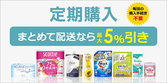 「定期購入サービス」を利用することで、毎日使う必需品が定期的に届くようになるため、買い忘れを防げるとともに注文の手間を減らせる。また、対象商品を「定期購入割引価格」で購入できるほか、配送間隔を30日・60日など自身の生活サイクルに合わせて調整可能となっており、複数の定期購入商品を同じタイミングで配送されるようにすれば、最大5%割引になる「まとめ割引」が自動適用される。