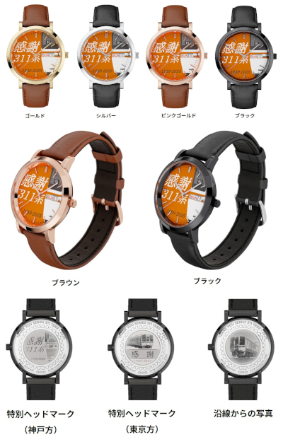 4色の本体カラー、2色の牛革製ベルトに加えて、レーザー刻印で仕上げる裏蓋デザインは特別ヘッドマーク×2種類、在りし日の311系の姿が思い出される沿線からの写真×1種類の計3種類から選べる。