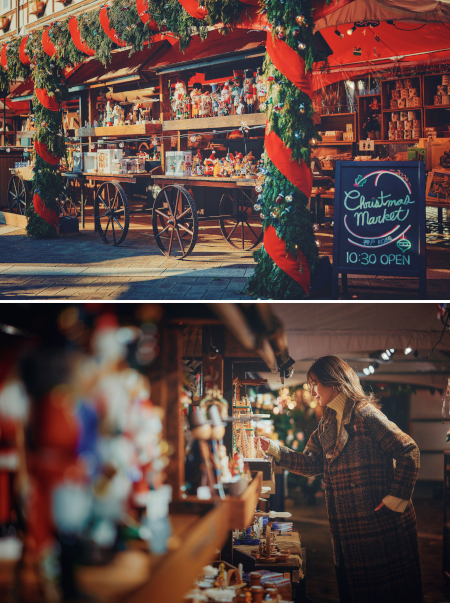 さらに、10時30分~16時30分(ナイター営業時は20時まで)に本場ドイツのクリスマスオーナメント(錫製・木製)やアドベントカレンダー、くるみ割り人形、煙出し人形、鳩時計などドイツの工芸品を取り揃える、ヒノキの葉と赤いリボンで覆われた可愛いテントが並ぶマーケットが登場する。ハーブ園のオリジナルブランド商品も充実しており、クリスマスの人気アイテムであるチョコレート商品やアロマキャンドルも購入できる。