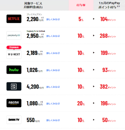 ソフトバンクも、ソフトバンクプレミアム「エンタメ特典」として、エントリーの上、対象のエンタメサービスを「ソフトバンクまとめて支払い」で支払うとPayPayポイントを付与するプログラムを提供しています。PayPayポイントの付与率は最大20%、通常は5%または10%です。なお、YouTubeは対象外です。