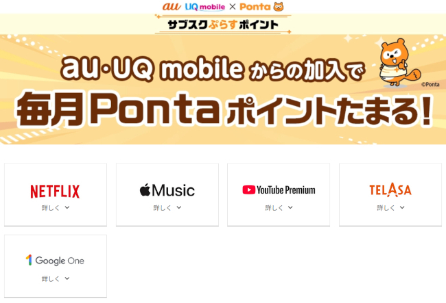 au/UQ mobileの「サブスクぷらすポイント」は厳選した5サービスのみ