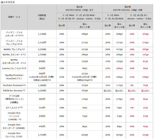 ドコモの「爆アゲ セレクション」のみ対象となっているストリーミング音楽配信サービス「Spotify」は25年8月以降順次、各プランの月額料金を値上げしました。これに伴い、ドコモの「Spotify Premium Standardプラン」(11月30日まで月額980円/12月1日以降は月額1080円)の「爆アゲ セレクション」による還元ポイント数は12月10日以降、既存契約者は「223pt」から「246pt」に上がりますが(還元率25%)、新規契約者(ドコモ ポイ活 20・ahamo・eximo・ギガホ)は「148pt」(還元率15%)に下がります。