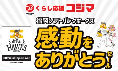 コジマは、福岡ソフトバンクホークスの活躍を讃え、「福岡ソフトバンクホークス 感動をありがとうセール」を、九州地区の「コジマ×ビックカメラ」6店舗で10月31日から11月9日まで開催する。