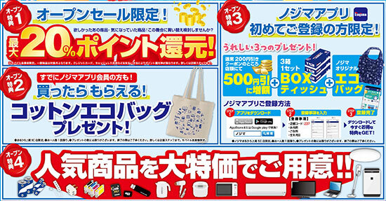 また、ノジマでは10月30日~11月21日の期間中、オープン限定特価としてノジマポイントが20%還元になるお得なセールも開催する。さらに、ノジマアプリへの新規登録で、500円引きクーポンやBOXティッシュ、ノジマオリジナルエコバッグをプレゼントする。すでにノジマアプリを登録している人には、商品購入でコットンエコバッグをプレゼントする。