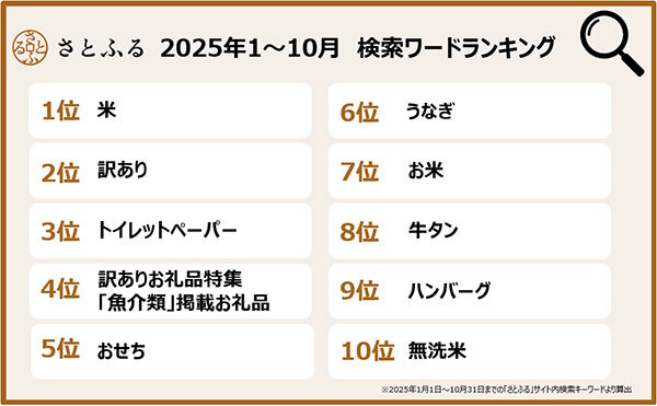 なお、1~10月の期間における「さとふる」での検索キーワードランキングでは、1位が「米」、2位が「訳あり」、3位が「トイレットペーパー」となっており、これら3つはいずれも2023年から3年連続でのトップ3入りを果たしている。