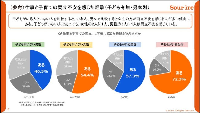「両立不安白書2025」によれば、これまで仕事と子育ての「両立不安」は女性の課題と考えられがちだったが、今回の調査では子どもを持つ男性の57.3%、女性の72.3%が「両立不安」を経験しており、子どものいない男性でも3人に1人、女性では2人に1人が「両立不安」を抱えていることが明らかになっている。