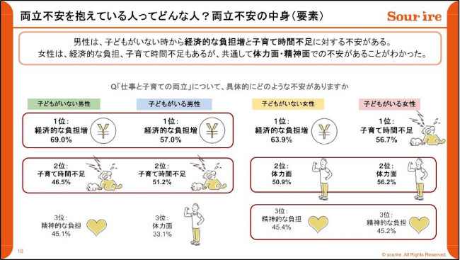 男性は「育児に十分関わりたいが仕事を減らせない」「家計を支えなければならない」といった板ばさみに、女性は「体力や精神的余裕の不足」に直面しており、「両立不安」は性別に限定された課題ではなく、社会構造的な課題であることが浮き彫りとなった。