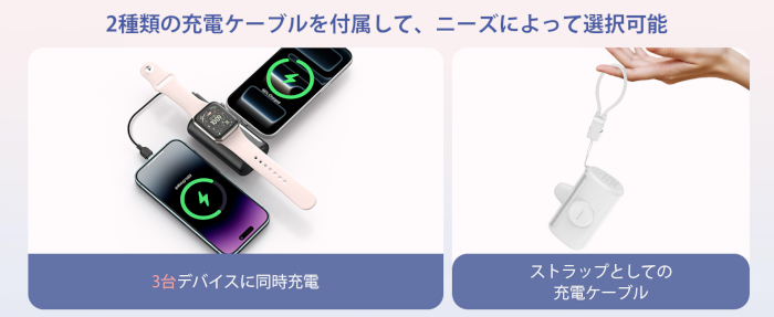本体は、マットな質感と丸みのあるフォルムで手に馴染み、上品な外観や触り心地に仕上げた。また、2種類の充電ケーブルが付属しており、iPhoneやApple Watchなどの機器を3台同時に充電可能となっている。