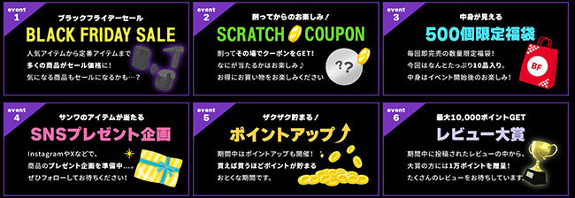 サンワダイレクトのブラックフライデーでは、デスクやマウス、バッグなど人気アイテムがお得な価格となるセール、Bluetoothスピーカーやモバイルバッテリー、6個口の電源タップなど便利なアイテムが10点入った5000円の限定福袋(先着500個)の販売、クーポンがその場で当たるスクラッチクーポン、富士ホーローコラボによるプレゼントキャンぺーンを行う。また期間中は、ポイントアップや、最大1万ポイント進呈のレビュー大賞といった企画も実施する。