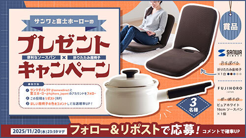 Xでは、サンワダイレクト(@sanwadirect)と富士ホーロー(@fujihoro_japan)のX公式アカウントをフォローし、該当ポストをリポストすると、参加できる。5色から選べる折りたたみ座椅子、ソースパン(ピュアホワイト)が抽選で3人に当たる。期間は11月14日12時から11月20日まで。