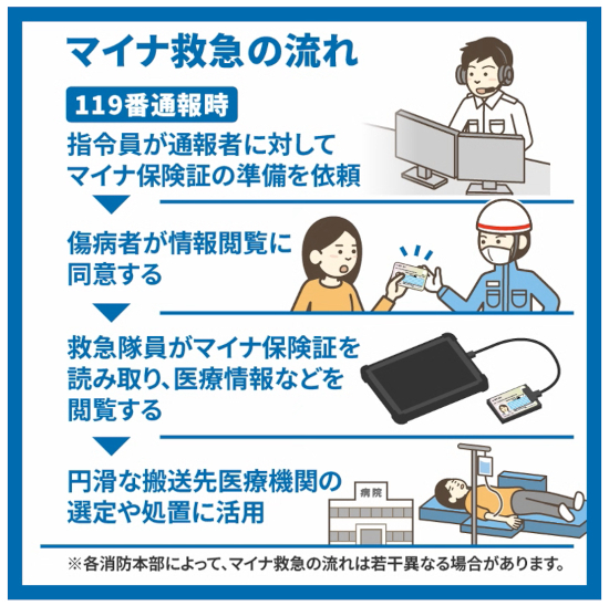 「マイナ救急」とは、救急現場で救急隊員が患者の「マイナ保険証(健康保険証として利用を登録済みのマイナンバーカード)」を活用し、受診歴や薬剤情報などを即時に確認して搬送先や処置を判断する仕組みです。
