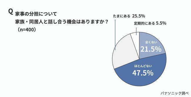 家事の分担について、家族や同居人と話し合う機会があるかを尋ねたところ、「まったくない」(21.5%)と「ほとんどない」(47.5%)を合わせた割合は、3分の2超に達している。