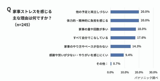 家事ストレスを感じる、おもな理由を尋ねた質問(複数回答)では、「他の予定と両立しづらい」と「体力的・精神的に負担を感じる」(どちらも20.0%)が最多となり、以下「家事の量や回数が多い」(18.0%)、「すべて自分でこなしている」(17.6%)が続いている。