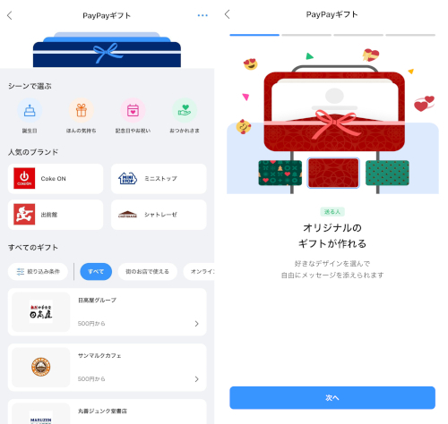 「Coke ON」や「トイザらス」などで使える商品券を送れるように