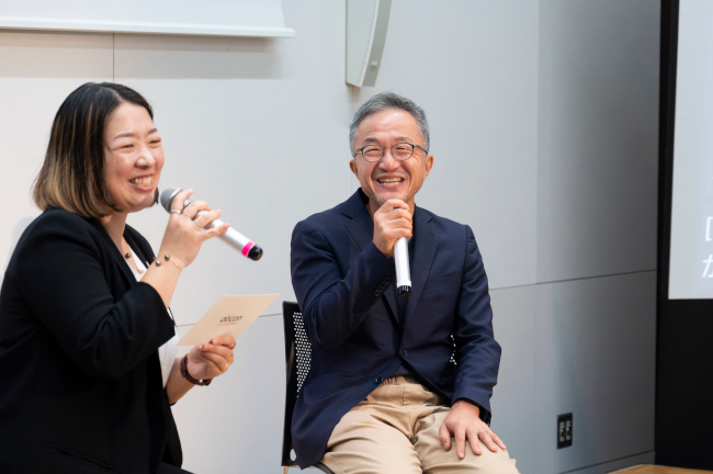 替わってステージに上がったのは、補聴器ユーザーの樋田祐一氏とデマント・ジャパンのコンタクトセンター、高井瑠美マネージャー(※「高」ははしごだか)。高井マネージャーの質問に答えて樋田氏が自分のQOLの変化について語る「わたしのライフチェンジストーリー コミュニケーションの力で笑顔をつなぐ」のセッションが始まった。
