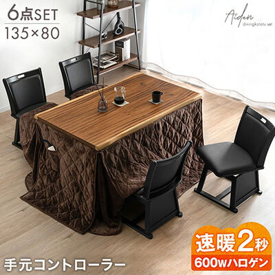 「一枚板風こたつセット」は、こたつテーブル・チェア・こたつ布団の6点セット。天板には天然木の突板を使用し、中央と外側で濃淡を切り替えることで、一枚板風の上質な雰囲気を再現している。また、側面には凹凸のある「なぐり加工」を施すことで、より自然な質感と立体感を持たせた。