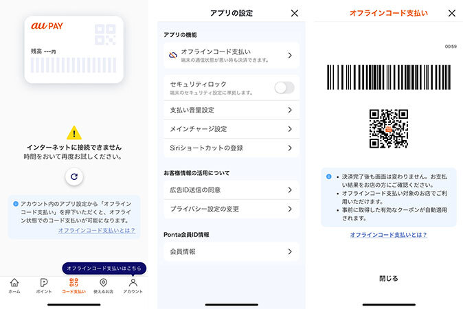 アプリ上で「オフラインコード支払い」画面を表示して、店舗側が表示されたコードを読み取ることで、地下などの電波が届きにくい場所やイベント会場といった混雑している場所、通信障害時など通信状態が悪い状況でも、コンビニエンスストアやドラッグストア、スーパーマーケットといった店頭で、「au PAY(コード支払い)」での支払いができる。