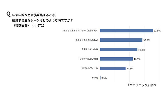 年末年始など家族が集まる際に、撮影するおもなシーンを尋ねた質問(複数回答)では、「集合写真」(71.5%)がもっとも多く、以下「孫や子どもとのふれあい」(57.2%)、「食事をしている時」(50.5%)が続いている。