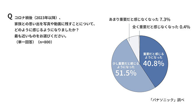 新型コロナ禍後(23年以降)、家族との思い出を写真や動画に残すことについて、どのように感じるようになったかを尋ねた質問では、「重要だと感じる」と「少し重要だと感じる」を合わせた割合が92.3%に達している。