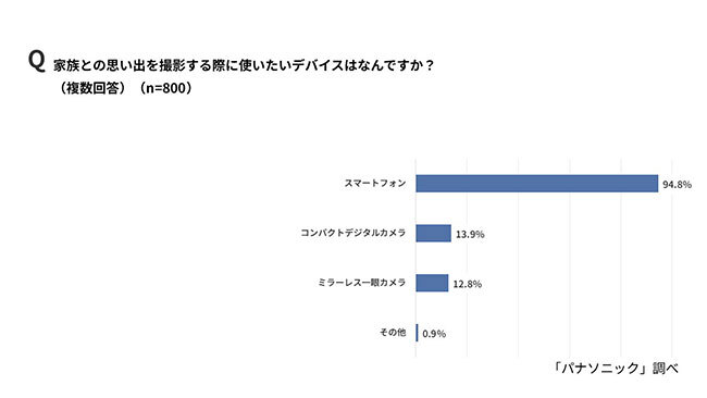 家族との思い出を撮影する際に使いたいデバイスとしては(複数回答)、「スマートフォン」(94.8%)がもっとも多く、「コンパクトデジタルカメラ」(13.9%)や「ミラーレス一眼カメラ」(12.8%)を挙げる回答も一定数みられた。