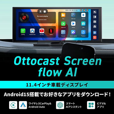 今回、販売が開始された「OTTOCAST ScreenFlow」と「OTTOCAST ScreenFlow AI」は、ディスプレー一体型のポータブルモニタで、ナビが古い車やナビがない車でも使える。また、後付ポータブルナビタイプでCarPlayもAndroid Autoもワイヤレスで使用可能なため、配線工事を行うことなく設置できる。