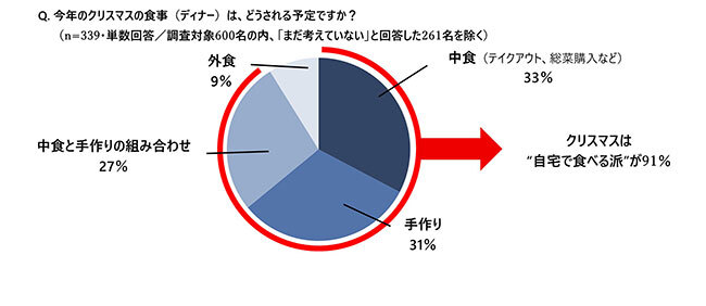 調査対象者に、今年(2025年)のクリスマスの食事(ディナー)は、どうする予定かを尋ねたところ、「中食(テイクアウト、惣菜購入など)」(33%)、「手作り」(31%)、「中食と手作りの組み合わせ」(27%)を合わせた、「自宅で食べる」割合が91%を占めた。また、中食と自炊を組み合わせる人が多いことも明らかになっている。