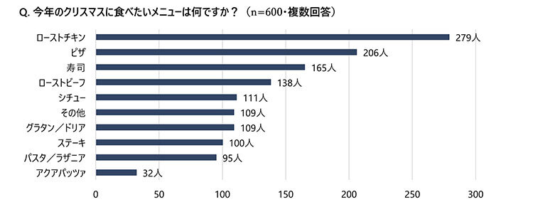 今年(2025年)のクリスマスに食べたいメニューを尋ねた質問(複数回答)では、「ローストチキン」「ピザ」「寿司」といった、皆で楽しめるパーティー感のある料理が上位を占めた。