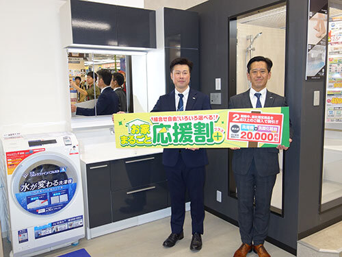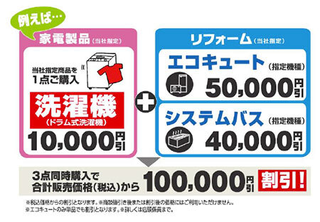 例えば、家電製品からドラム式洗濯機(1万円引き)とリフォームからエコキュート(5万円引き)とシステムバス(4万円引き)の3点を同時購入した場合、合計販売価格から10万円の割り引きとなる。