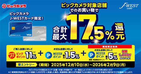 ビックカメラグループは12月10日~2026年2月9日の期間、近畿・中国地方の8店舗において会計時にビックカメラJ-WESTカードで支払うと、購入金額の5%分に相当するWESTERポイントが還元されるキャンペーンを開催している。