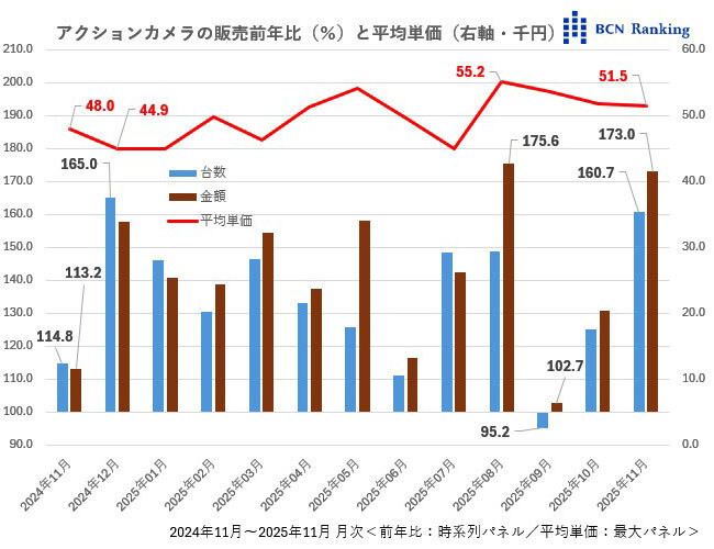 アクションカメラ市場全体は伸びている。販売前年比はここ数年、毎月のように2桁増で推移。足元の11月でも、台数160.7%、金額173.0%と絶好調だ。ビデオカメラに占める販売台数構成比も、この3年で急速に拡大。22年11月時点では24.1%に過ぎなかった。しかしこの7月では56.6%と過半を占めるまでに増大している。11月でも48.2%と、市場のほぼ半数を占めるペースを維持している。ちなみに、従来からある「横型」のビデオカメラは、22年11月には販売台数の65.9%を占めていた。しかしこの11月では13.4%まで縮小している。