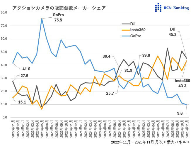 アクションカメラの代名詞的存在だったGoProのシェアが急落している。同社が最後にトップシェアを獲得したのはこの1月。39.6%で一瞬首位を奪還した。ライバル2社の平均単価が上昇するのをしり目に、年始特価で単価を1割下げ台数を稼いだ。しかし、その後シェアは下落の一途。この11月では9.6%と、ついに2桁を割り込んだ。毎年発売しているフラグシップの新モデルが登場しなかったことも響いた。一方、激しくトップを争っているのはDJIとInsta360だ。11月現在でDJIが45.2%でトップ。Insta360も43.3%と僅差で追いかける。2月以降この2社でトップシェアを取り合うデッドヒートが続いている。全国2300の家電量販店やオンラインショップの実売を集計するBCNランキングで明らかになった。