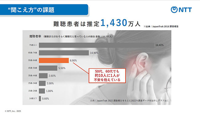 加齢が引き起こす問題の一つに聞こえ方がある。日本補聴器工業会がまとめたJapanTrak調査報告によると、国内では推定で1430万人が難聴者という。さらに65歳未満でも難聴、もしくは難聴と思っているのは約10人に1人と報告されている。