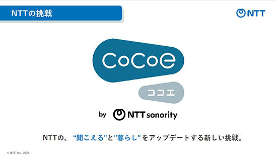 大西常務は「NTTグループでは半世紀以上にわたって音に関する研究開発を続けてきました。その培ってきた技術を活かして、聞こえづらくなってきた方々へもう一度、音を耳元へお届けするため、新しいブランド『cocoe』を発表します」と述べた。
