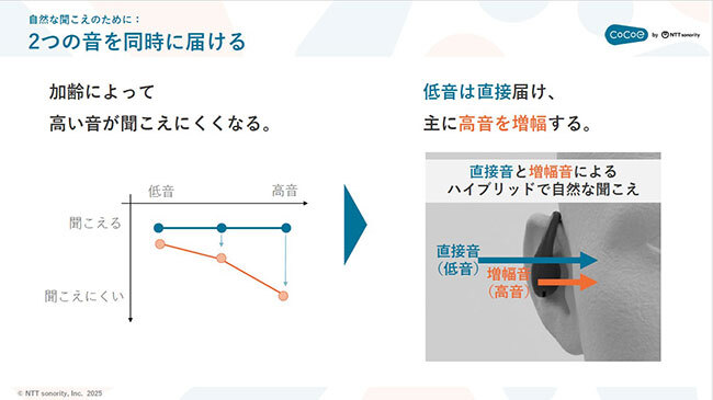 「人は加齢によって高い音が聞こえにくくなってきますが、低い音はそれほど影響を受けません。cocoe Earは低い音はそのまま耳に届け、高い音を増幅します。つまり、直接音と増幅音のハイブリッドで自然な聞こえ方を実現しています」