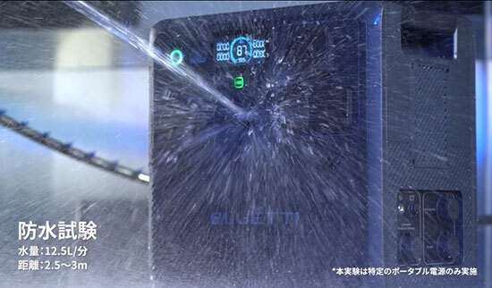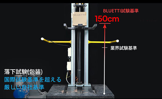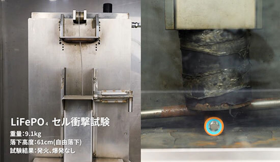 ポータブル電源の核は、内蔵電池のバッテリーセル。ここに関しては特に安全性を重視し、バッテリーセルそのものに約9kgの重りを61cmの高さから当てる衝撃試験やバッテリーセルに釘を刺して10分間放置する釘刺し試験、バッテリーセルに最大13.0kNの圧力をかける圧壊試験を行っているという。