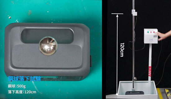 製品本体では本体の6面をそれぞれ下に向けて3回落とす落下試験や120cmの高さから500gの鋼球を本体に当てる鋼球落下試験、輸送状況を可能な限り忠実に再現した電磁振動試験、150m/秒の速度で落下させる耐衝撃試験などを行っている。