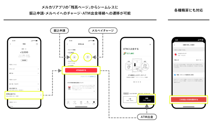 あわせて、「メルカリバンク」で連携されたみんなの銀行の口座残高は、メルカリアプリ内の「おさいふ」タブに表示され、いつでもかんたんに確認できる。また、「メルペイ」へのチャージや「メルカード」の清算にも利用できるので、これまで以上にスムーズな売上金の活用が可能になる。