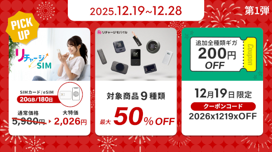 12月28日までの期間は、「クリスマスセール」として、「SIMカード/eSIM(20GB/180日)」を通常価格5980円のところ、特別価格の2026円で購入できる。