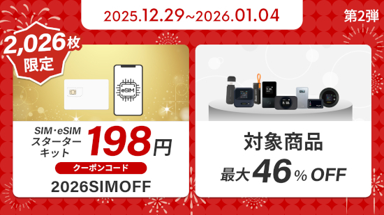 12月29日~2026年1月4日の期間は、「SIM・eSIMスターターキット」が通常価格1980円のところ、クーポンコード「2026SIMOFF」で90%オフの198円になる「年末年始セール」が、2026枚限定で開催される。