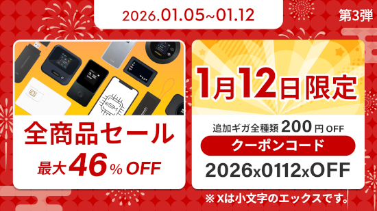 さらに2026年1月5~12日の期間には、全商品が最大46%オフになるほか、2026年1月12日限定で追加ギガ全種類が200円オフになる(要・クーポンコード「2026x0112xOFF」)、「新年セール」も開催される。