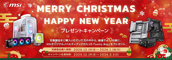 エムエスアイコンピュータージャパン(MSI)は12月19日~2026年2月1日の期間、対象製品を購入して応募した人の中から抽選で20名に、MSIオリジナルノベルティグッズの入った「Lucky Bag」をプレゼントする、「Merry Christmas & Happy New Yearプレゼントキャンペーン」を開催している。
