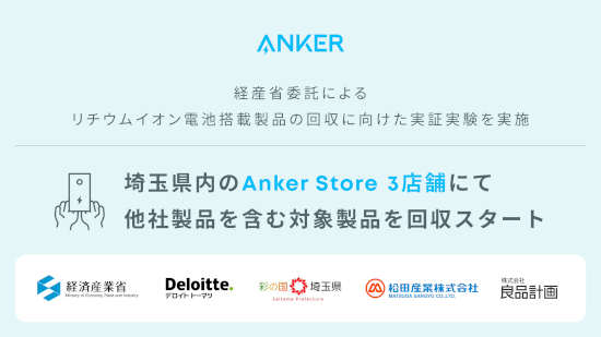 アンカー・ジャパンは12月22日から、経済産業省、デロイトトーマツ、埼玉県、松田産業、良品計画と共同し、他社製品を含むリチウムイオン電池を内蔵したモバイルバッテリー、ワイヤレスイヤホンの回収の実証実験を埼玉県内のAnker Store 3店舗で実施している。期間は2026年1月23日まで。
