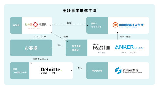 実証実験は、デロイトトーマツが経済産業省からの委託を受けて行われているもので、回収実験は、リサイクラーと製品製造者の連携によるリチウムイオン電池等回収実証事業として実施。アンカーと良品計画が回収ボックスの設置、回収店舗における各種製品の回収・管理を担っている。