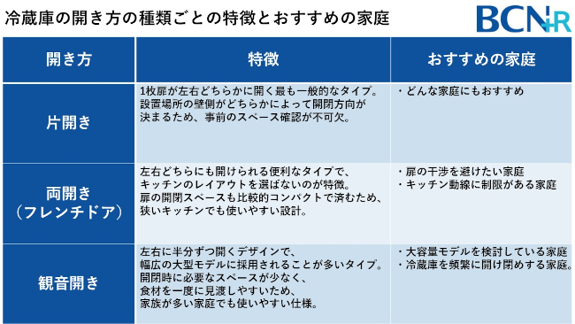 冷蔵庫の使い勝手を大きく左右するのが「ドアの開き方」です。ドアの開き方がキッチンの動線や設置スペースと合っていないと、毎日の出し入れがしづらくなるため、購入前に必ず確認しておきましょう。