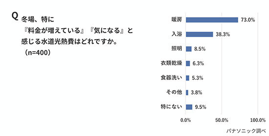 調査対象者に、冬場特に「料金が増えている」「気になる」と感じる水道光熱費を尋ねたところ(複数回答)、「暖房」(73.0%)がもっとも多く、「入浴」(38.3%)がそれに続いた。毎日行う家事である「食器洗い」を挙げる回答は5.3%に留まっている。なお、資源エネルギー庁のデータによれば、家庭における用途別エネルギー消費では、「暖房」よりも「給湯」の方が大きな割合を占めているという。